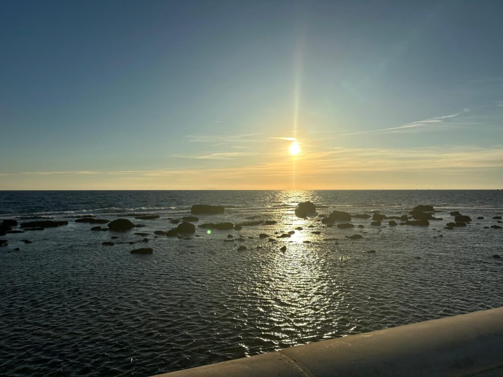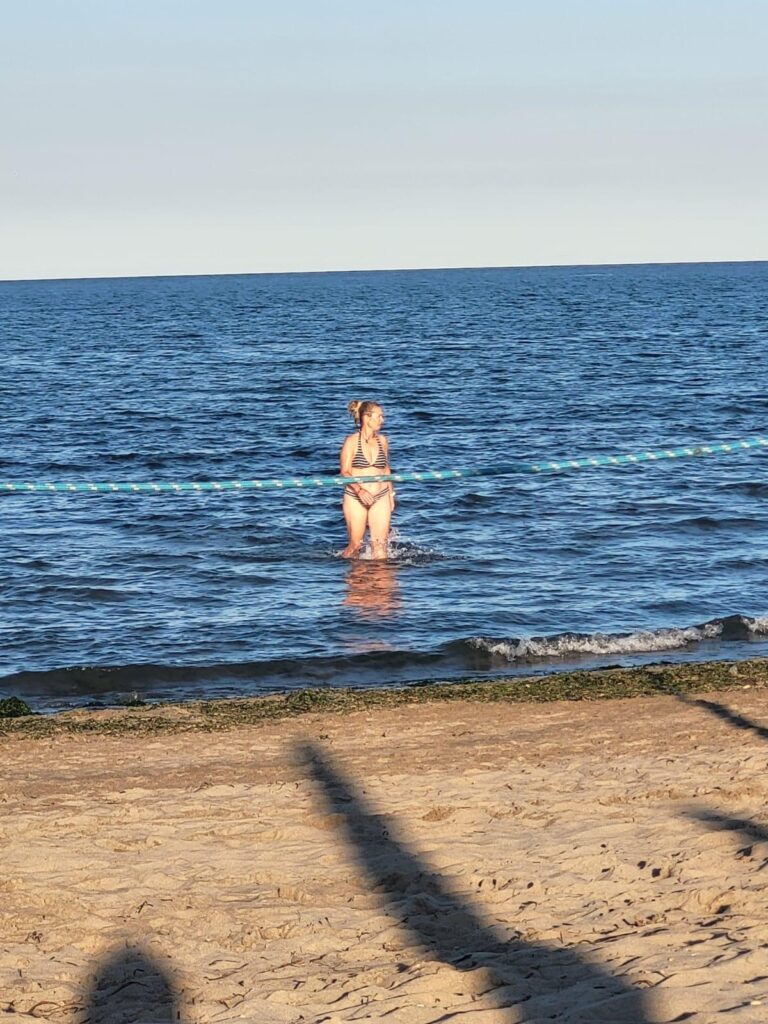 Das Schwimmen im Meer war immer noch super angenehm! Wenngleich es mehr Flundern als Schwimmen ist, weil das Wasser ja sehr weit hinaus flach bleibt. (Und nein, weder Bauch noch Busen streifen am sandigen Meeresgrund; bei meinem Schwimmstil sind es die Füße! Kann sein, dass ich da seit meinem letzten Schwimmkurs 1974 was verlernt habe…)