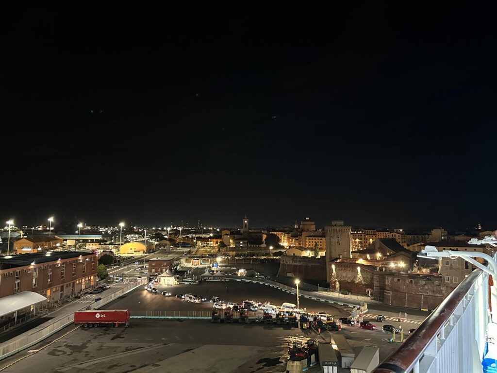 Die Nacht ist ruhig aber sehr kurz. Um 5.30 reißt einen der italienische Drillsergeant per Lautsprecher aus dem Schlaf. Ich verstehe nur 1/3, selbst wenn das Englisch sein soll. Jedenfalls müssen wir raus aus den Kabinen, denn in 1,5h (!!!) landen wir an. Gleich nach der Ansage pumpert jemand an die Kabinentür. Das passiert genau 3 x mal. Liegenbleiben ist nicht.