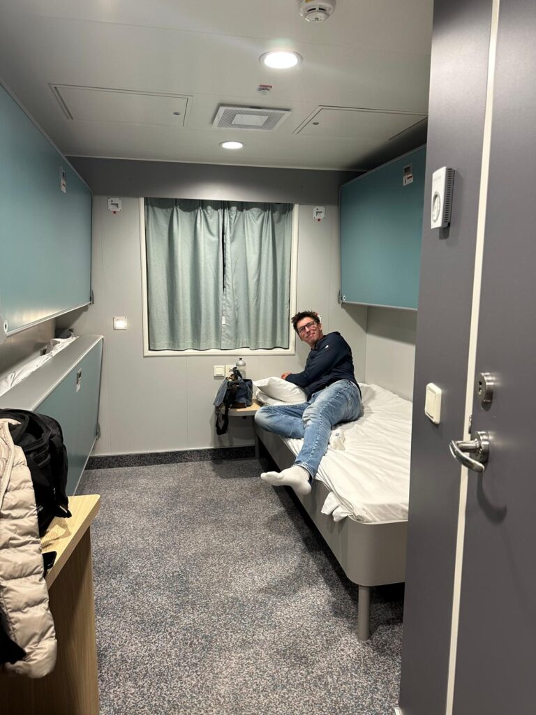 Wir haben uns bewusst für eine sehr moderne Fähre entscheiden, dass sich diese allerdings als so ein feudales Schiff entpuppt, freut uns umso mehr. Viele Stunden früher parken wir unser WoMo auf einem Parkplatz beim Fährenzugang. Der Stellplatz füllt sich schnell. Kam uns unser Bus groß vor, so merken wir jetzt erst, was für ein Zwergerl wir haben. Wir sind umzingelt von meterlangen Bussen. Quasi eine deutsche Motorhome-Enklave mit Schweizer Einsprengseln.