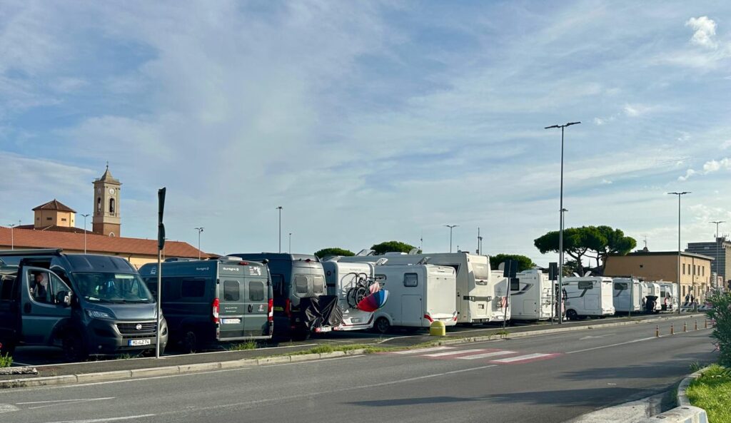 Sind wir die letzten Reisen immer unabsichtlich in große Sportveranstaltungen geraten (Milano Fußball Stadtderby, Spanien Championsleagefinale…) so war diesmal eine pro Palästina-Demo. Die Zufahrt zu unserem Stellplatz war – zunächst – unmöglich, da die Straße mit Palästina-Fahnenschwingenden Demonstrant:innen blockiert war. Die Banneraufschrift „Blocchiamo tutto“ (Wir blockieren alles) verhieß nichts Gutes. Ein bisschen opportunistisch haben wir durch Hupen und Daumen-hoch Zeichen unsere Solidarität geäußert. Wir wussten ja nicht, ob die Vermummten der ersten Reihen eh friedlich wären. Aber alles verlief peaceful, wie es einer solchen Thematik auch angemessen ist. (Vielleicht habe ich ja nicht alles, was so auf den Bannern stand, verstanden, aber ich vermisste schon die Israel-Perspektive, da war nix von „Bring-them-home“ o.ä. zu lesen… Naja, das ist ein komplett anderes Thema, das nicht hierher gehört.)