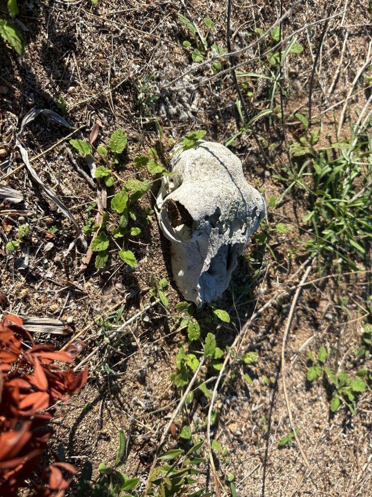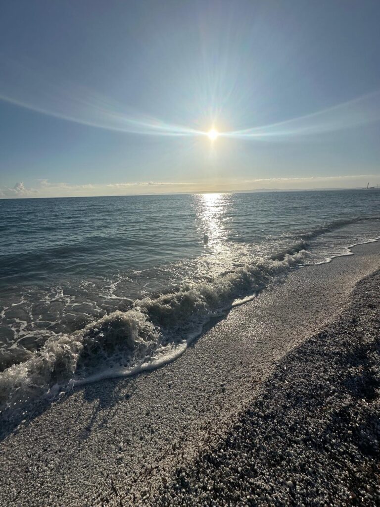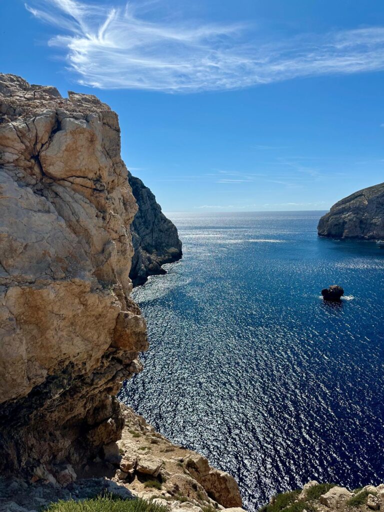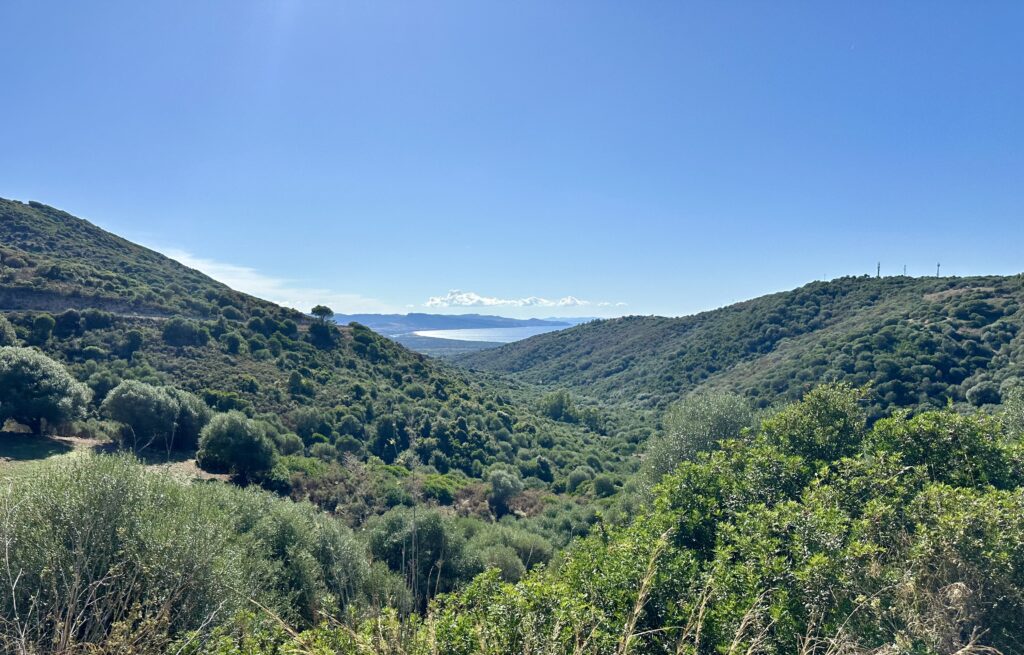 Zunächst fuhren wir von Olbia nach Golfo Aranci, einer kleinen Hafenstadt, wo wir Rast machten und eine unverschämt teure Caprese (20 Euronen für 1 kleines Mozzarella Bällchen und geschmacklose Tomaten und 2 Basilikumblättchen) aßen. Wir haben es trotzdem genossen, weil übermüdet von der Fähre und weil sehr schönes, hellblaues Meer! Hier machten wir zum ersten Mal die Erfahrung der schlechtgelaunten Kellner:innen. Da dachten wir noch, es handle sich um eine Ausnahme…