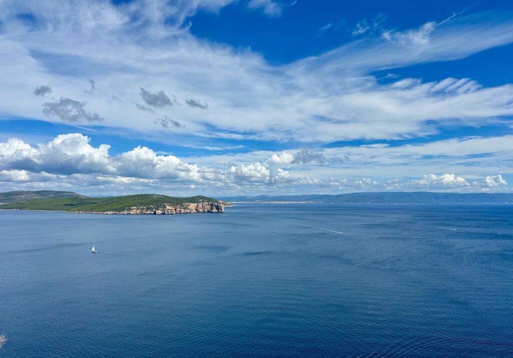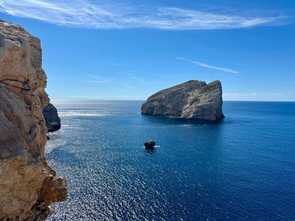Auf dem Weg zu unserer nächsten Station bei Alghero machen wir einen Umweg über Capo Caccia – ein wirklich spektakulärer Felsen mit vielen alten Wachtürmen aus dem 12-16 Jahrhundert. Waren Piraten in Sicht, wurde durch ein ausgeklügeltes Lichtzeichensystem mit der befestigten Stadt kommuniziert.