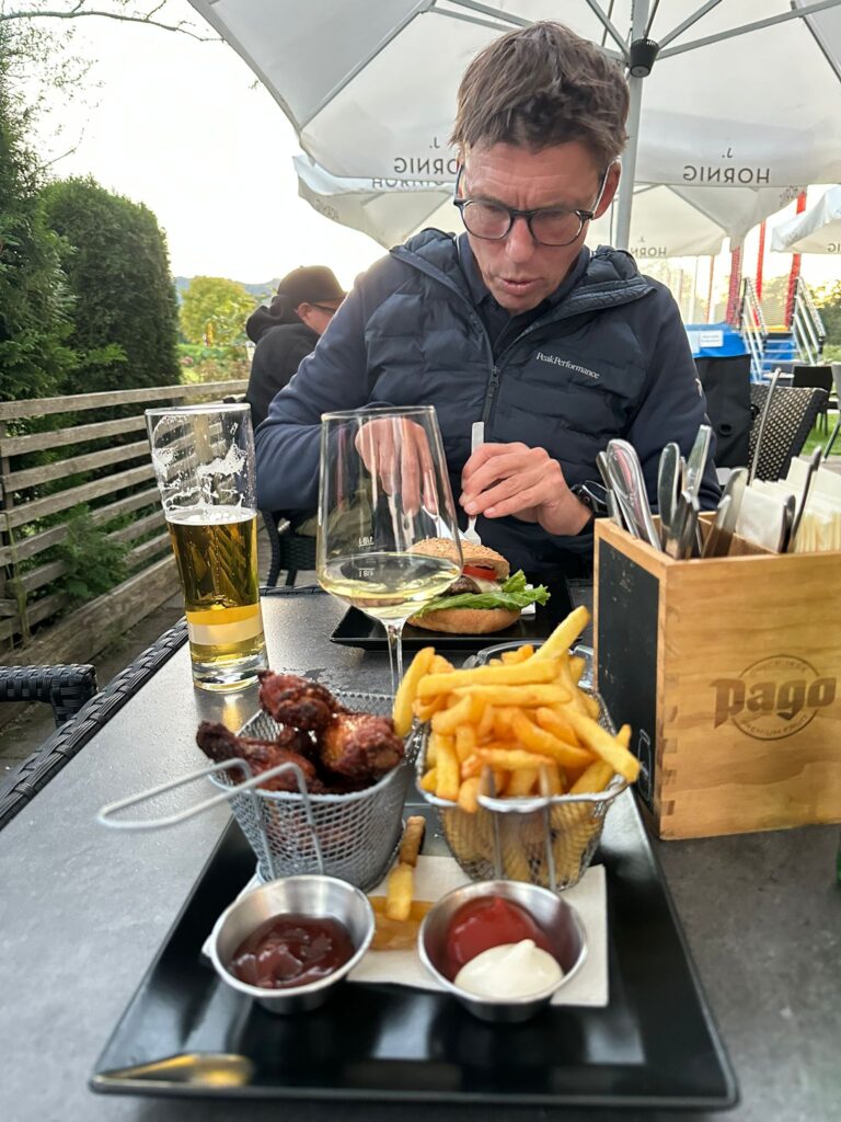 Wir landen schließlich bei „Poldi“, einer Art Strandcafé und begnügen uns mit Chicken Wings mit Pommes und eine Poldi-Burger. Nach 18 Loch mit Taschetragen geht’s mehr um „überhaupt was“ als ums „besonders gut“.