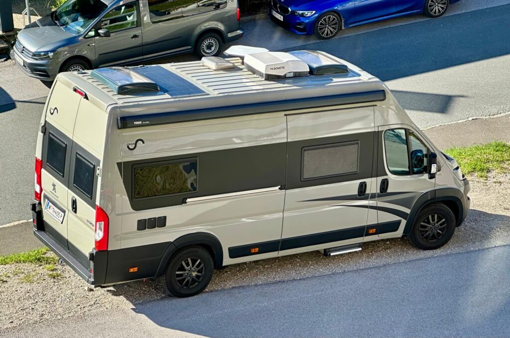 Der Van da ist Vanda (kreativer Name, oder?) und gehört seit März dieses Jahres uns. Es ist ein Peugeot, ausgebaut von Megamobil. Vanda ist 640 cm lang und 210cm breit. Sie ist ein sog. H3, also das höchste Ding, das es als „Auto“ gibt, weil sich der Mann ja sonst nur gebückt fortbewegen könnte. Diese physische Tatsache hat auch Einfluss auf die Autolänge, denn mit über 1,80 willst du nicht im Querbett schlafen.